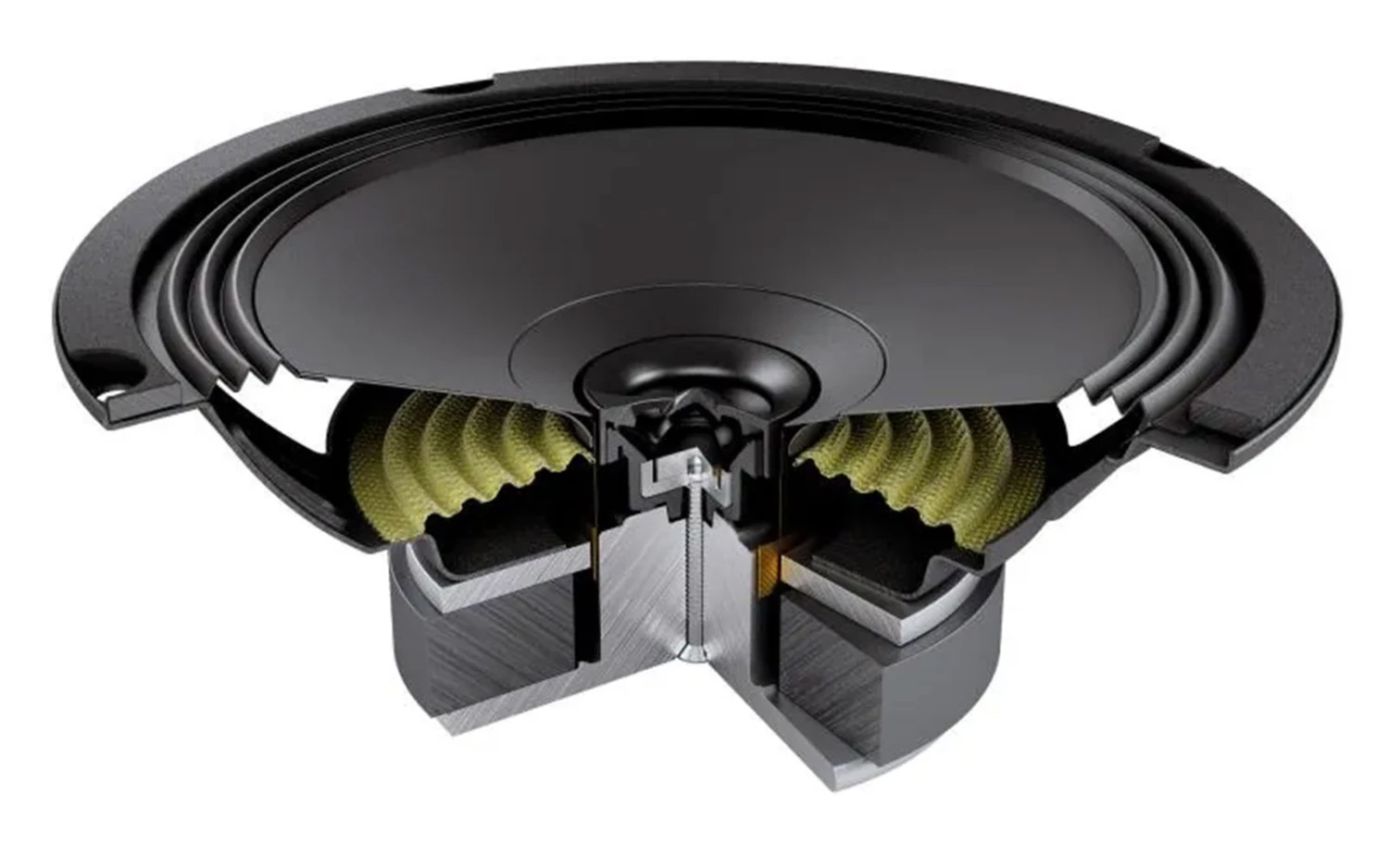 Der APX 6.5 verfügt über einen konzentrischen Koaxial-Hochtöner: mit einem einzigen Punkt der Schallabstrahlung ist es möglich, eine konsistente phasengleiche Antwort zu erhalten, mit einer konsequenten Rekonstruktion der akustischen Szene, vergleichbar mit einem System von separaten Tieftöner + Hochtöner. Die 6.5″-Membranen-Sicke verfügt über das exklusive flache Triple-Wave-Profil, für maximale Auslenkungslinearität.