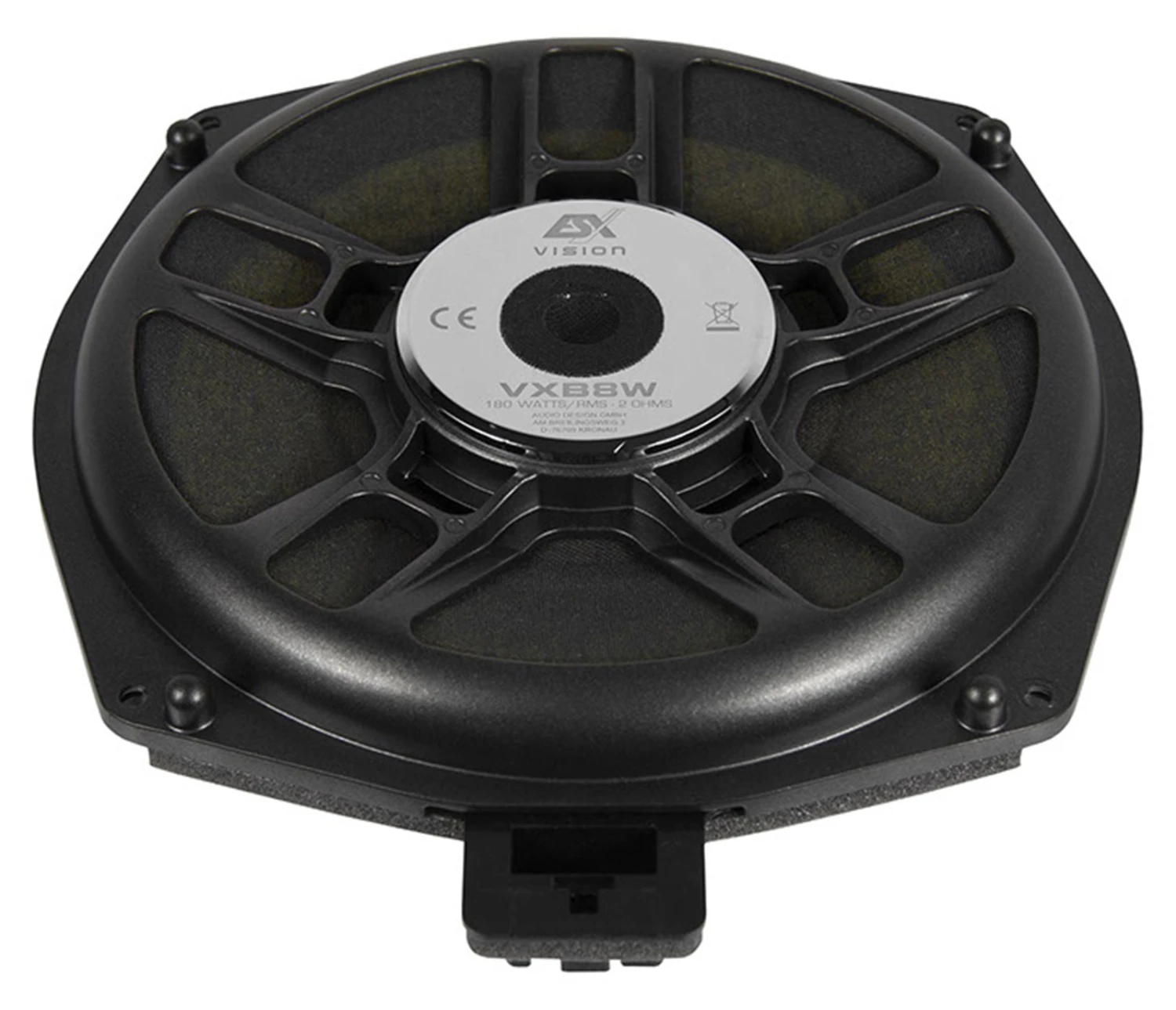 Neben den unglaublich guten Mittel- und Hochton Lautsprechern ist ganz klar das VXB Subwoofer-Duo zu nennen. Mit den großen 51 mm Schwingspulen, einer Belastbarkeit von 180 Watt RMS an 2 Ohm und einer speziell auf hohe Pegel ausgelegte Kevlar-Verbundmembran, welche mit einem speziellem Schaumstoff aus Deutschland „verbacken“ wird, bringen die Subwoofer die Hosenbeine zum Flattern. Viele handelsübliche Nachrüst-Bässe für BMW sind zwar zu hören, aber nicht so wie die ESX Tieftöner auch zu spüren! Eine Freude für all diejenigen, denen ein pfundiges Bassbrett bisher gefehlt hat.