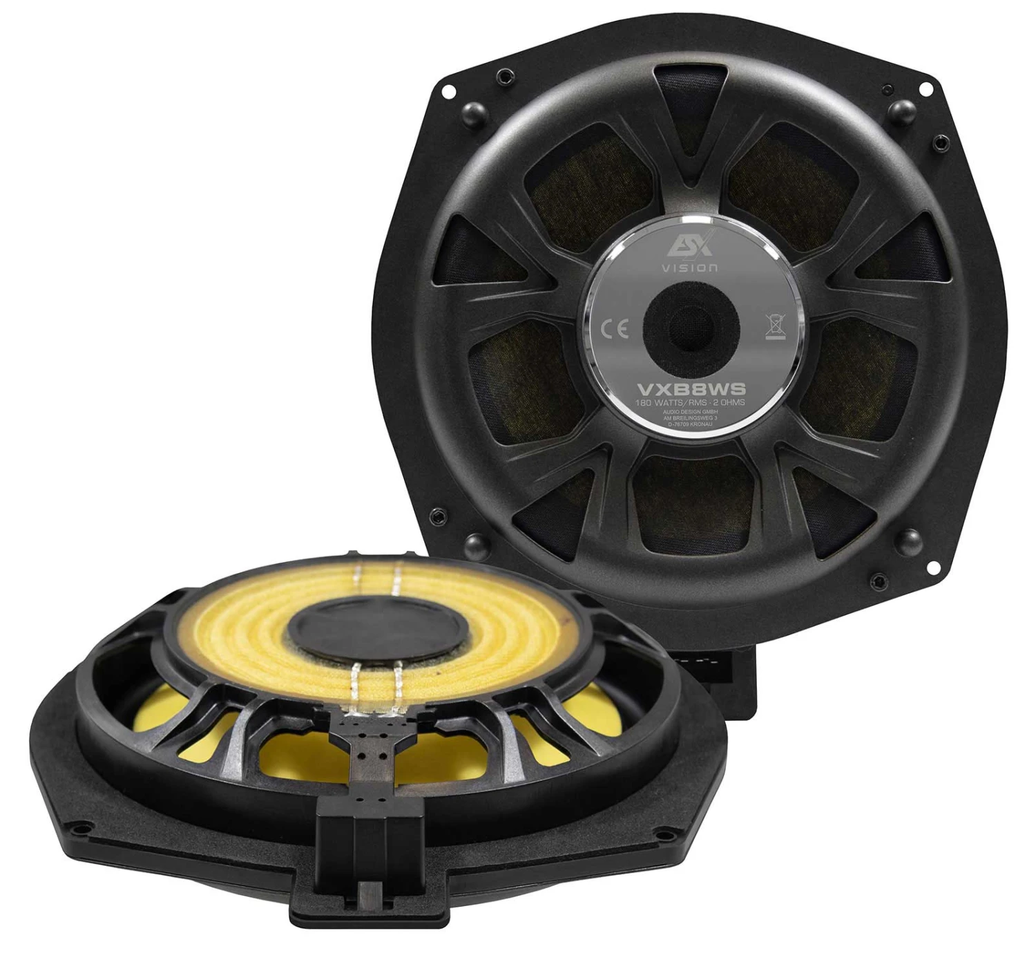 Die paarweise gelieferten VXB8WS Subwoofer verfügen ebenfalls über robuste, sehr groß dimensionierte 51 mm Schwingspulen, die bis zu 180 Watt RMS an 2 Ohm belastbar sind. Dadurch lassen sich sehr hohe Pegel mühelos wiedergeben. Um eine Verformung der flachen Membranen zu verhindern, verwendet ESX in den hochwertigen Subwoofern einen Verbundwerkstoff aus Kevlar und einem speziellen Schaum. Im Vergleich zu handelsüblichen BMW Bässen sind die ESX Subwoofer nicht nur hörbar, sondern auch spürbar überlegen. Die VXB8WS sind zweifellos mit die besten Bässe für BMW-Fahrzeuge, die es derzeit auf dem Markt gibt.