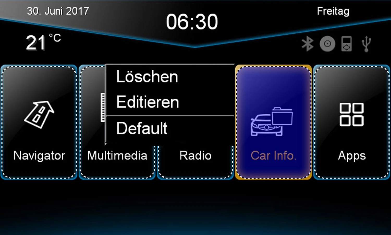 - Fahrzeugeinstellungen wie z.B. Beleuchtung, Klimaprofil, Zentralverriegelung, Scheibenwischer, Park-Assistenten, Reifendruckkontrolle können über das Gerät eingestellt oder kontrolliert werden – fahrzeugabhängig