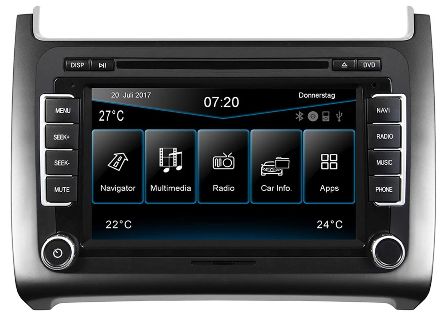 Das Polo 6C Gerät auf i20 Plattform ist als Basisgerät mit Blende in 3 verschiedenfarbigen Varianten lieferbar.