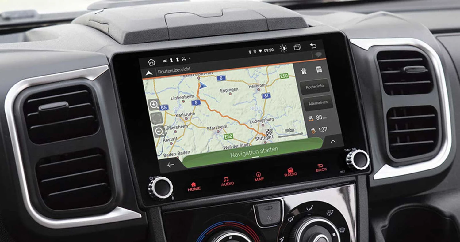 - Fahrzeugspezifischer i45 Smart Naviceiver mit 22,8 cm (9″) Touchscreen für Fiat Ducato 8, mit A60-Navisoftware