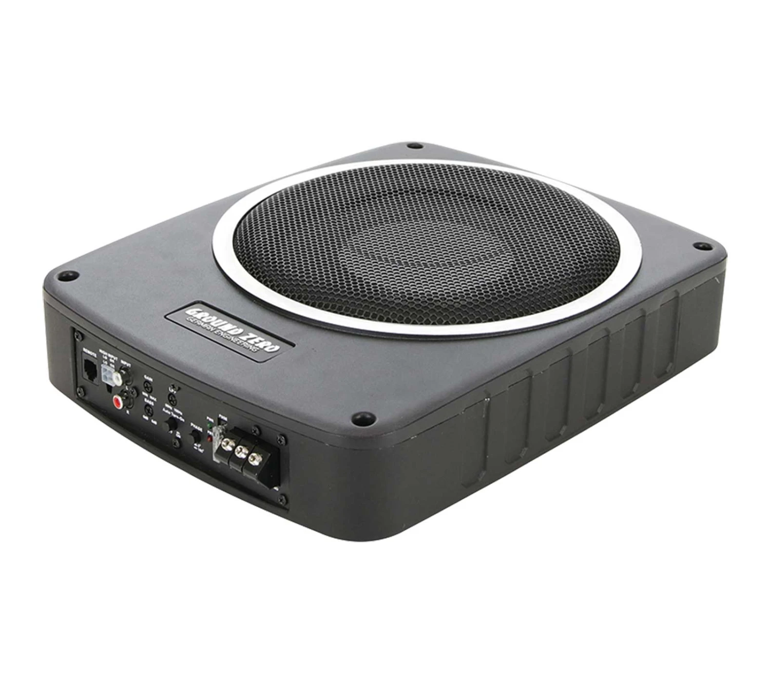 - Flaches Untersitzgehäuse mit Verstärker und 25 cm Subwoofer