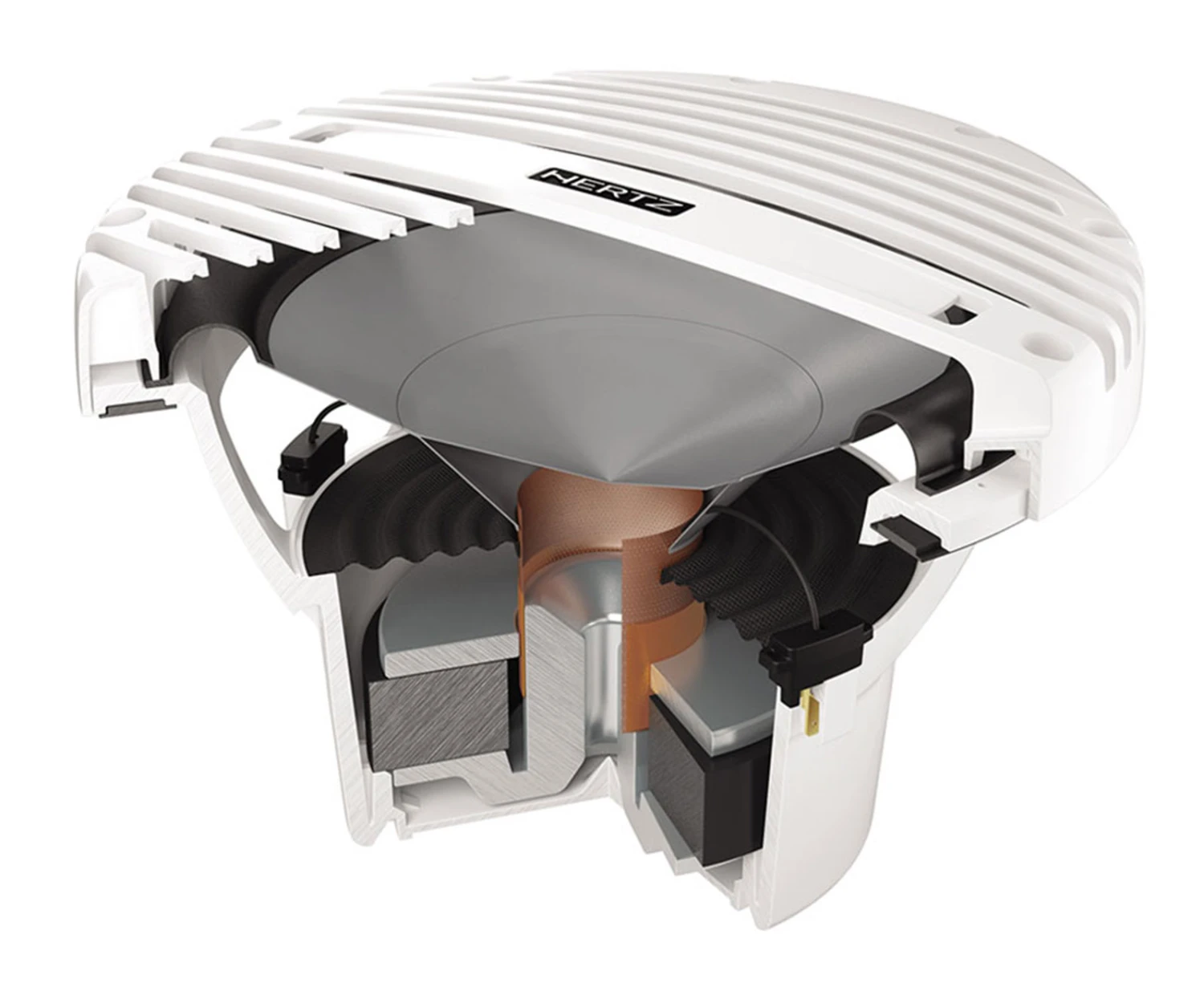 - Langhub-Tieftöner mit 50-mm-Schwingspule (2″), entwickelt für Anwendungen mit unendlicher Schallwand, mit Polypropylen-Membran, die mit UV-Inhibitoren eingespritzt ist, und mit komprimierter Santoprene-Sicke.